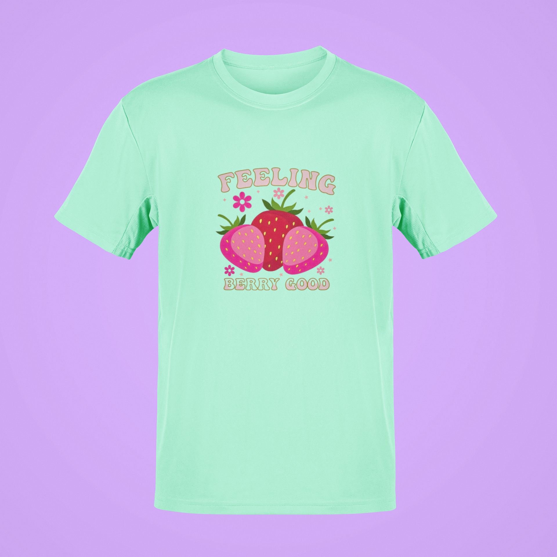 Spread some juicy joy with every step. This pastel cream regular fit tee features a vibrant strawberry graphic and the feel-good phrase “Feeling Berry Good” — the perfect pick for days when you're vibin’ with sunshine, smiles, and sweet energy.
