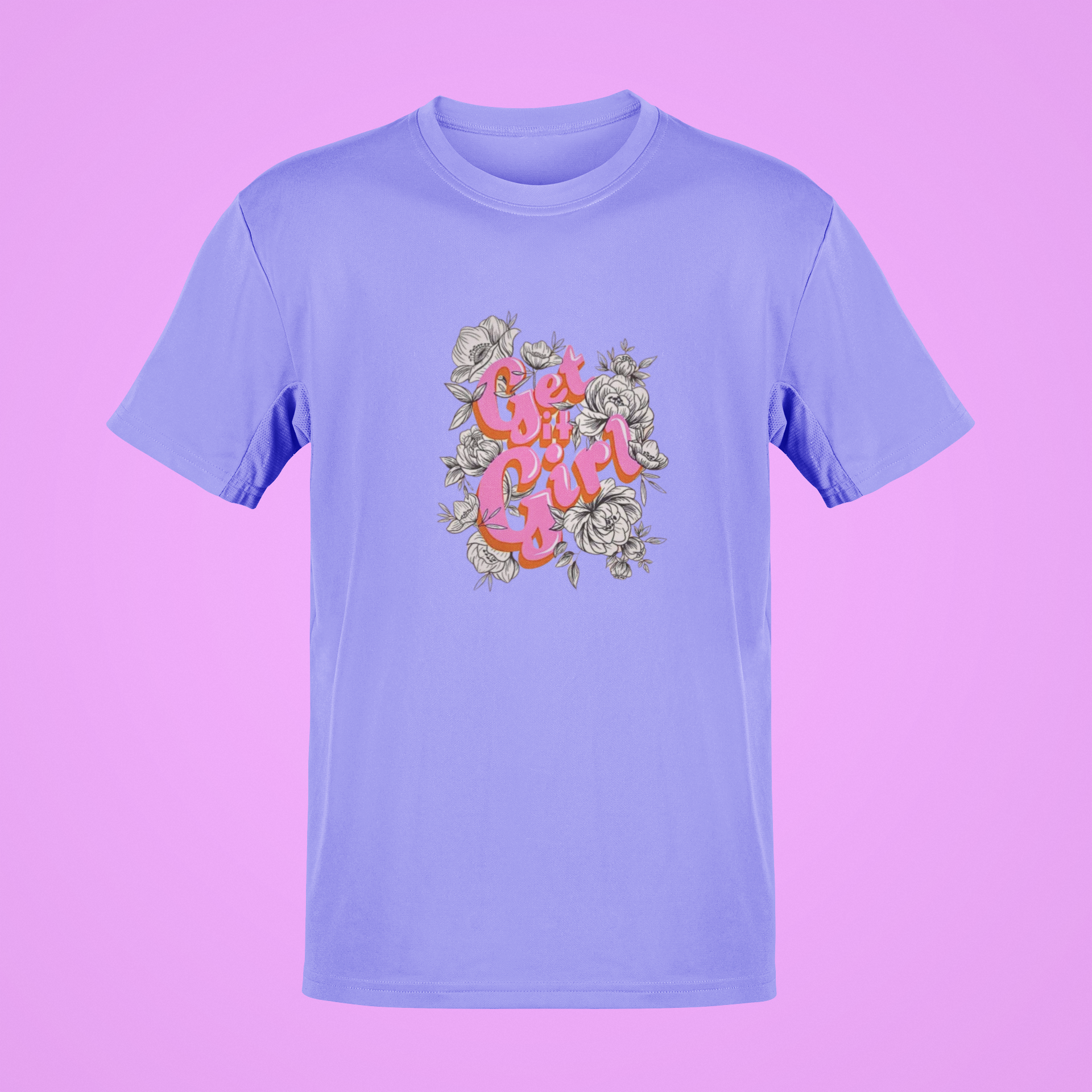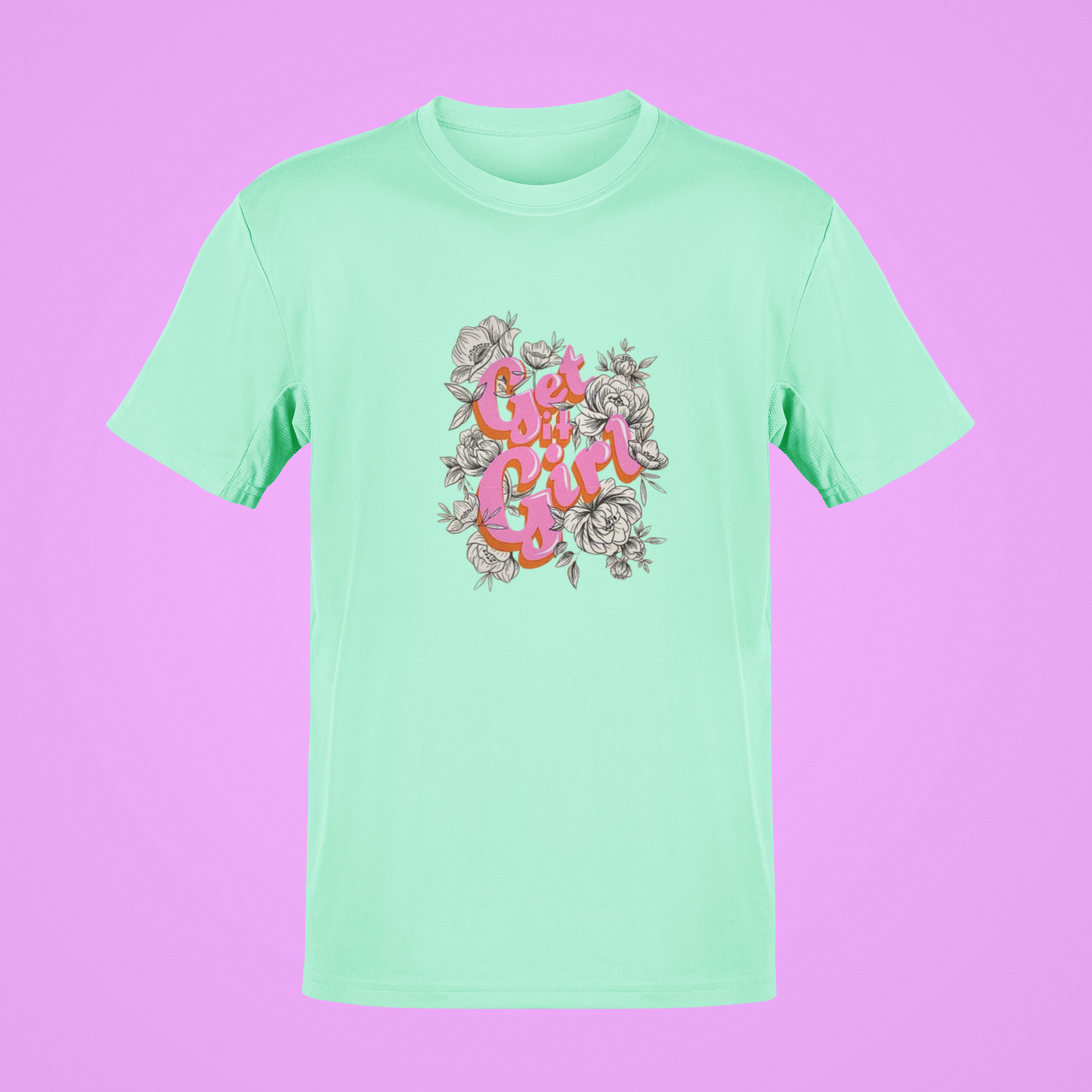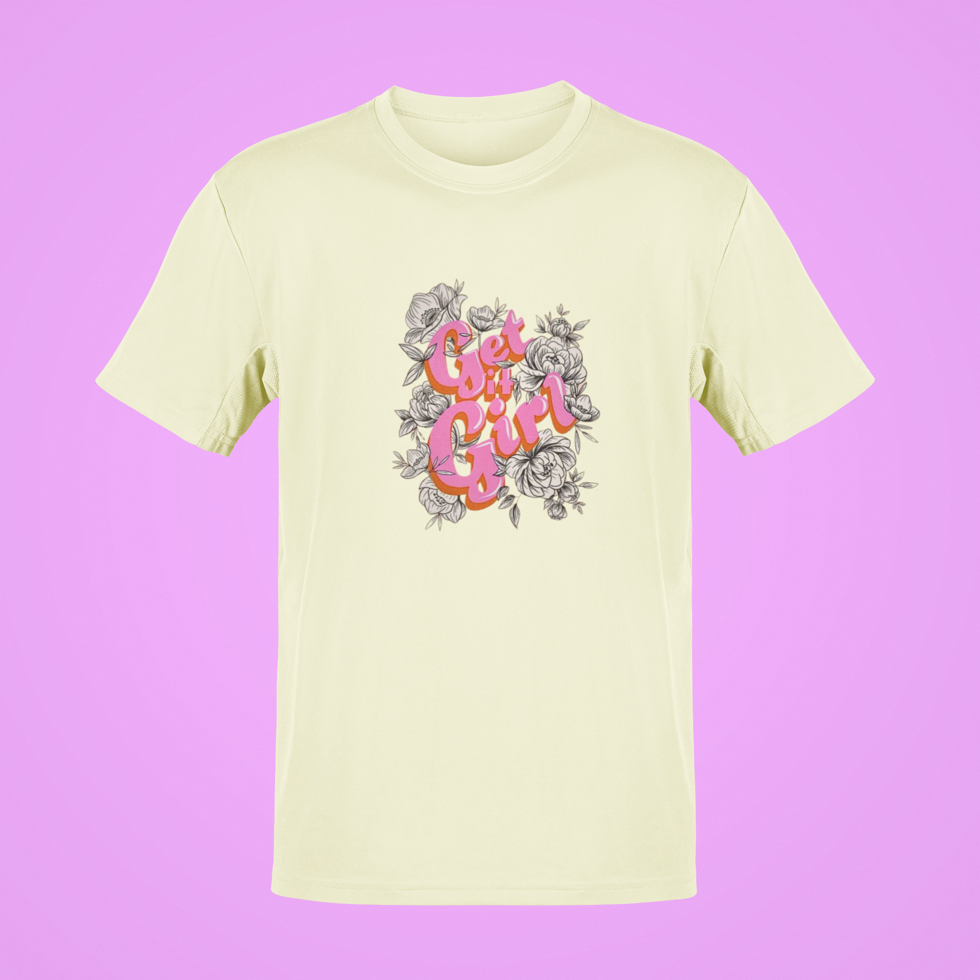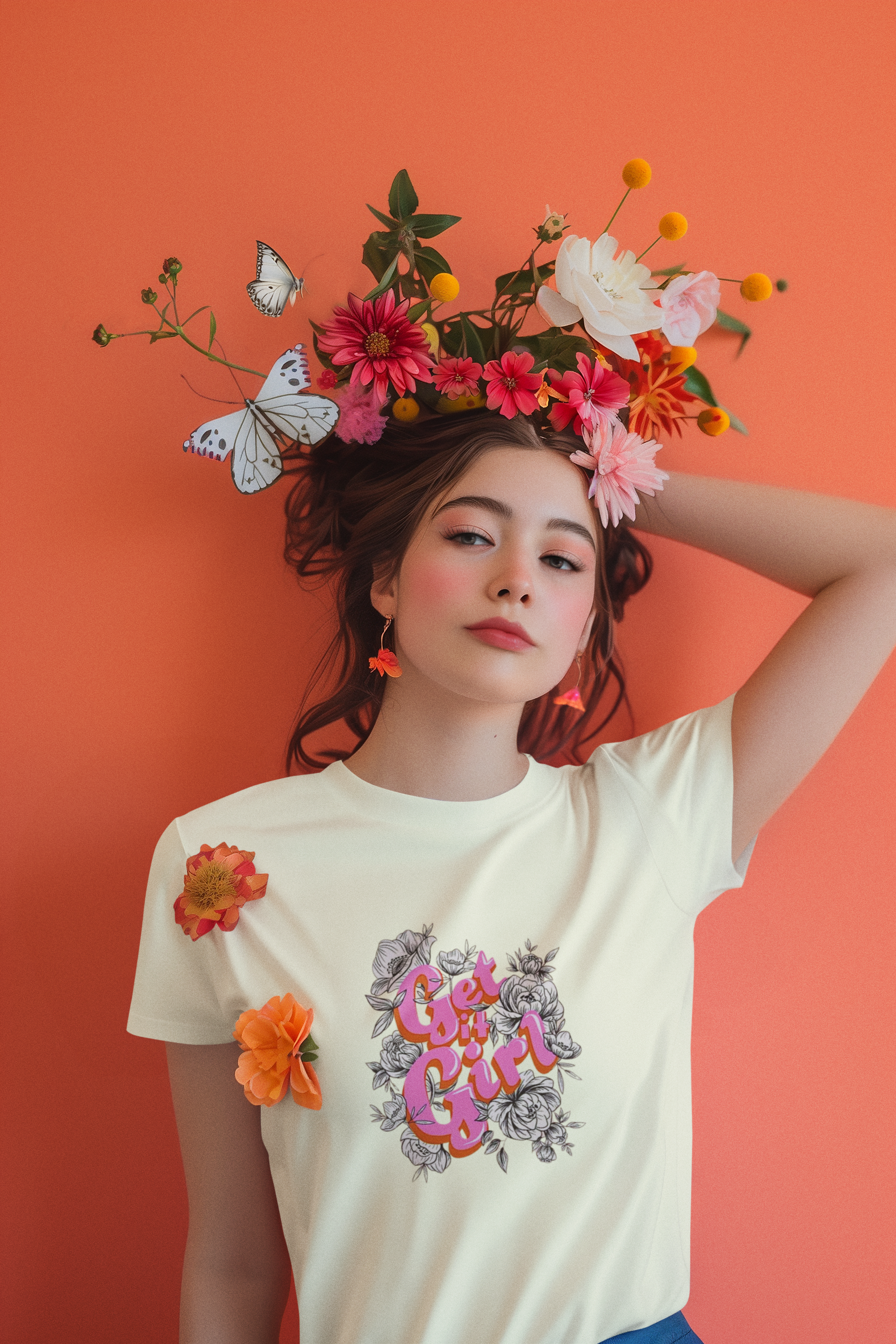 Fierce meets floral. This soft cream regular fit tee brings major main character energy with its hand-drawn rose backdrop and vibrant “Get It Girl” typography in hot pink and orange. It’s a loud and lovely reminder to own your power and bloom unapologetically.