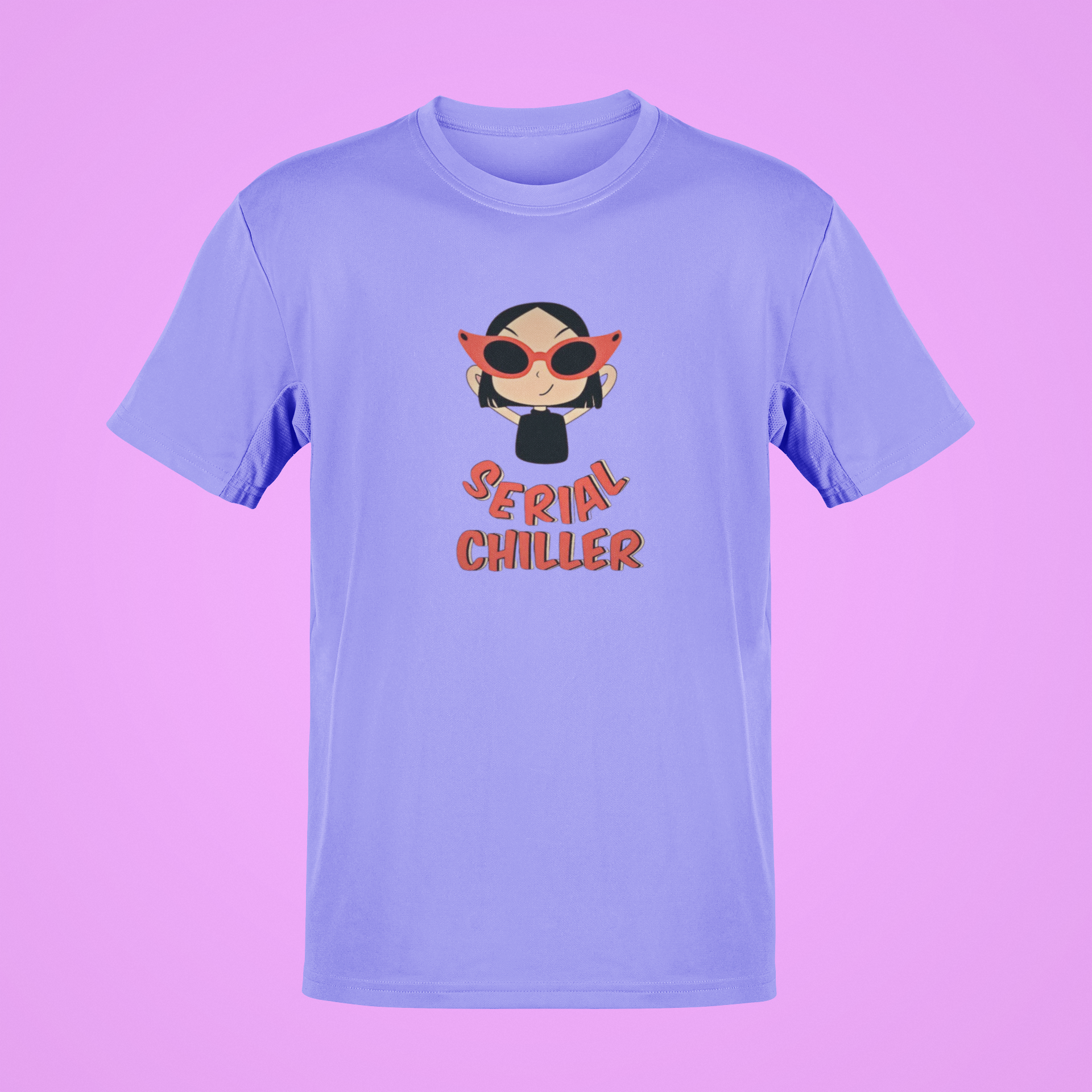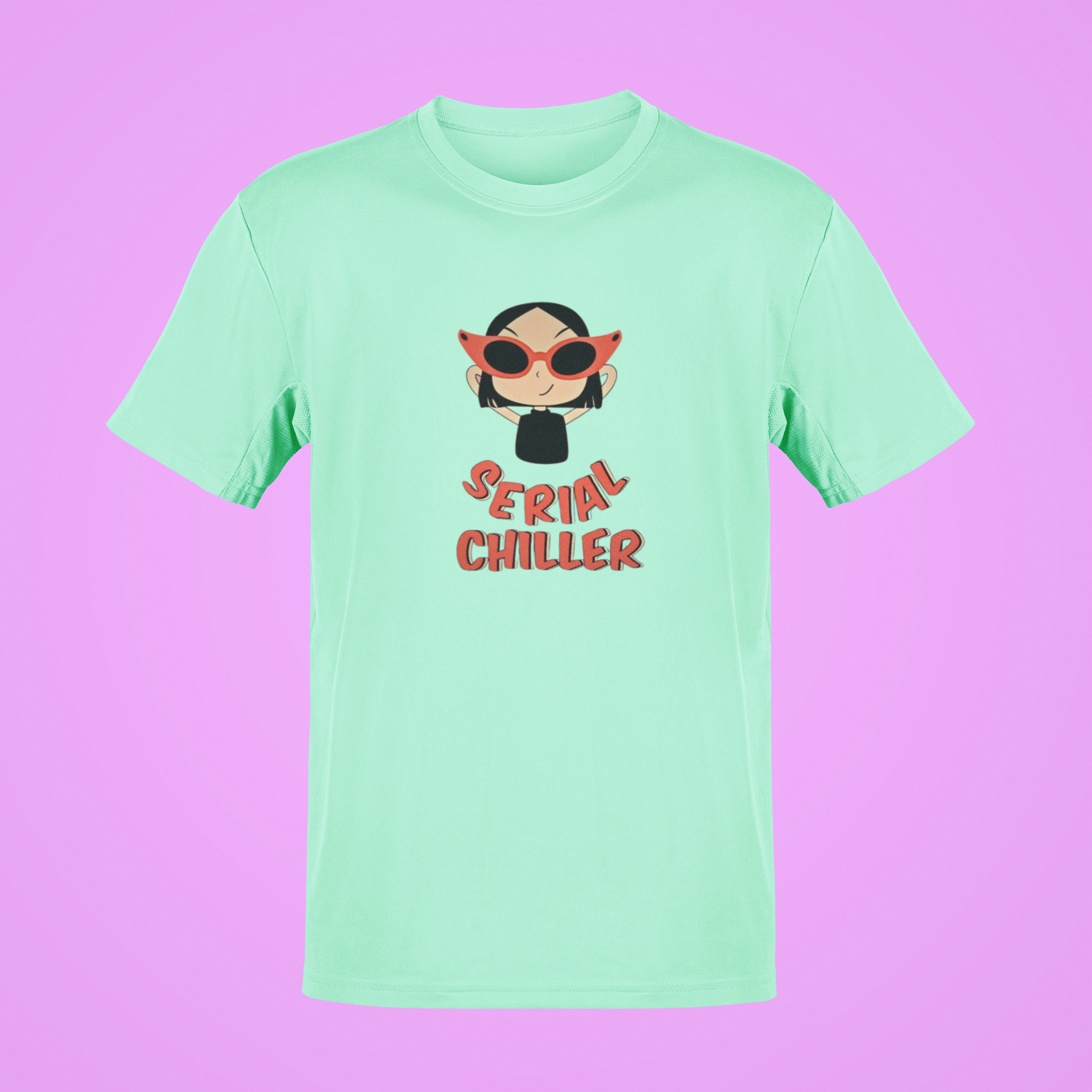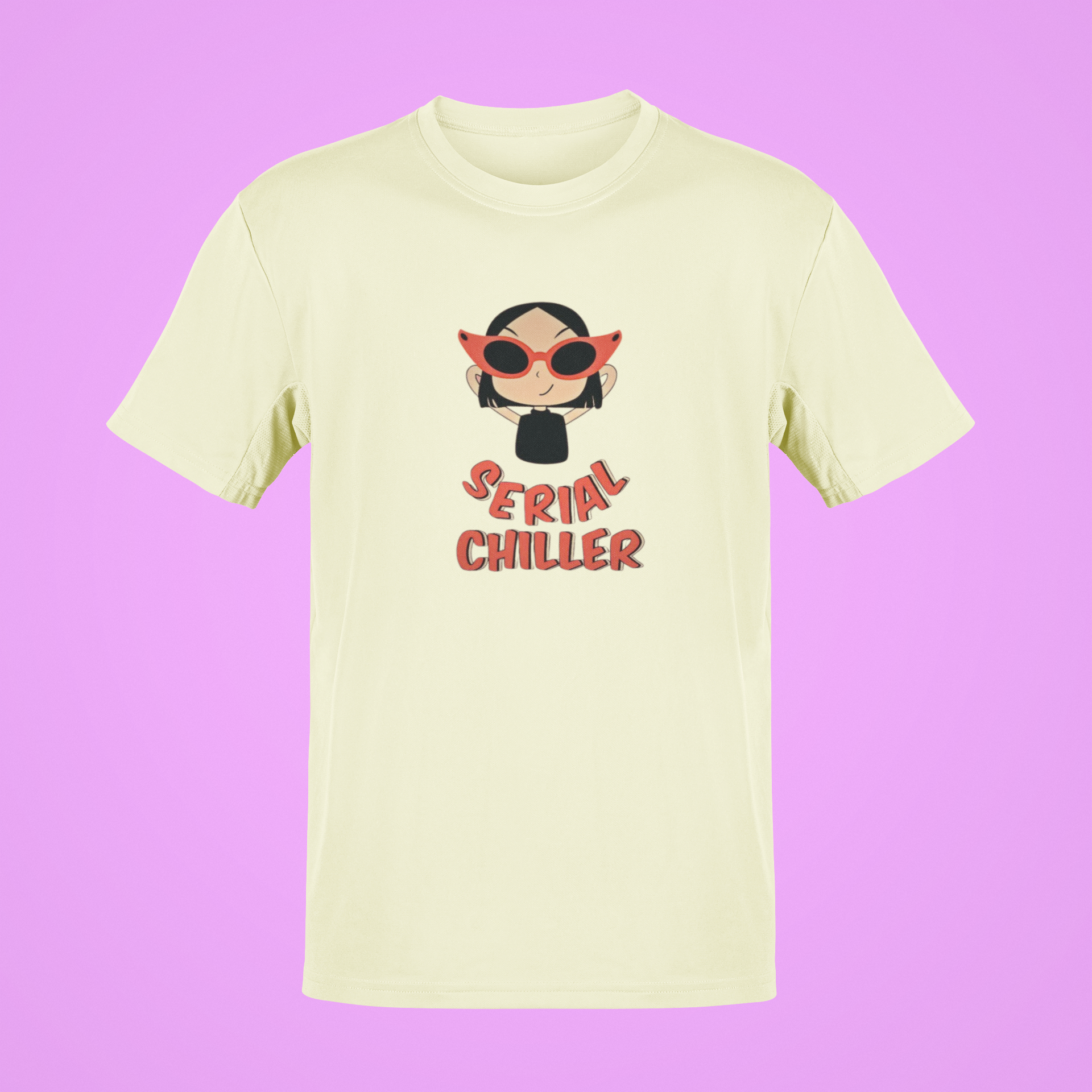 Chill mode: always on. This light cream regular fit tee brings effortless cool with a fun cartoon character rocking bold red cat-eye shades and the iconic phrase “Serial Chiller”. It's your perfect partner for relaxed weekends, cozy vibes, and low-effort slay days.