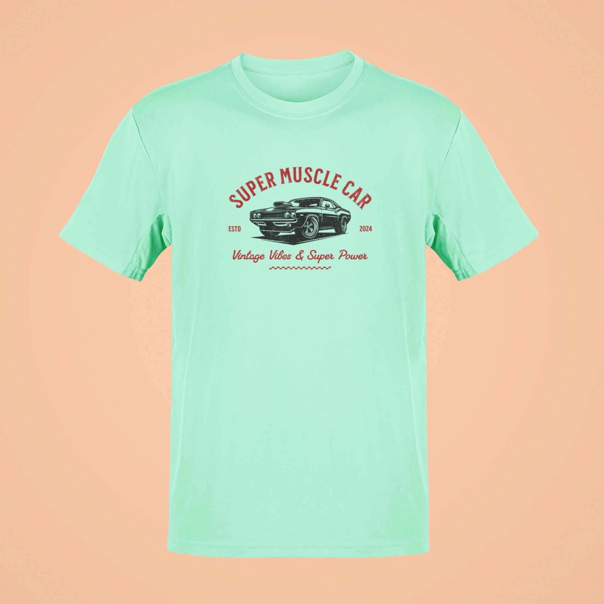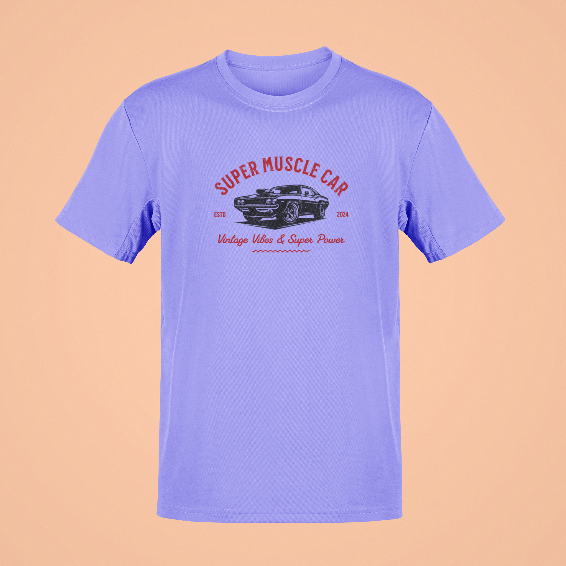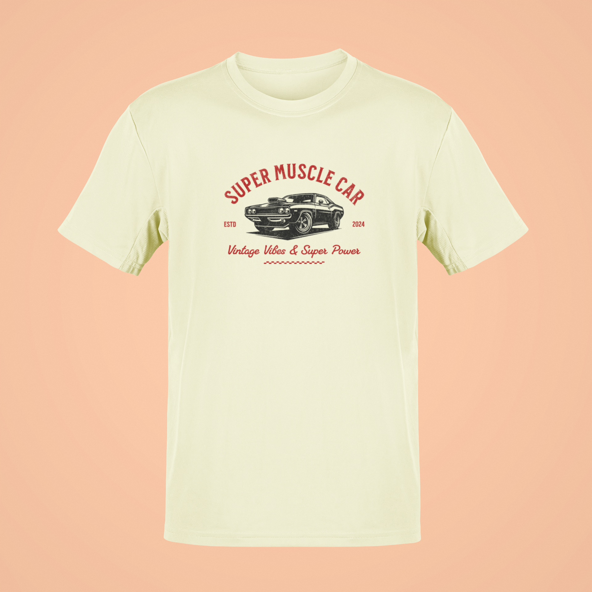 Classic horsepower never goes out of style. This off-white regular fit tee features a bold vintage muscle car graphic with “Super Muscle Car” and “Vintage Vibes & Super Power” typography, giving you a throwback look that hits the street with attitude and nostalgia.